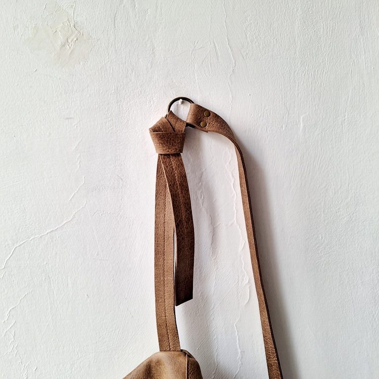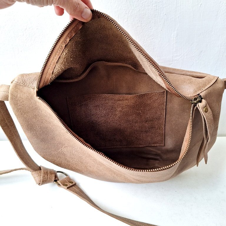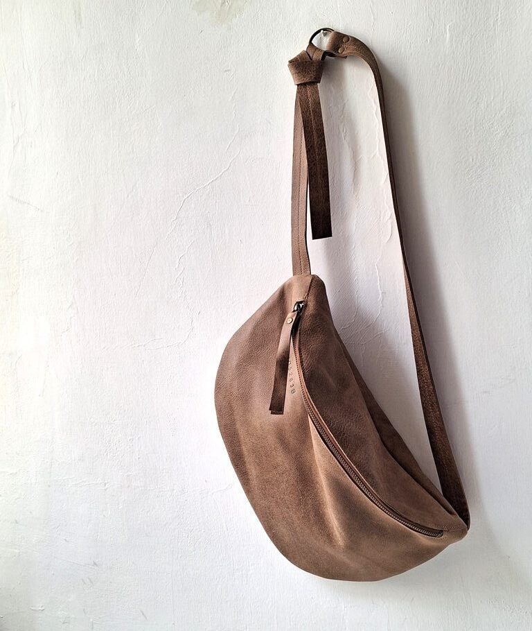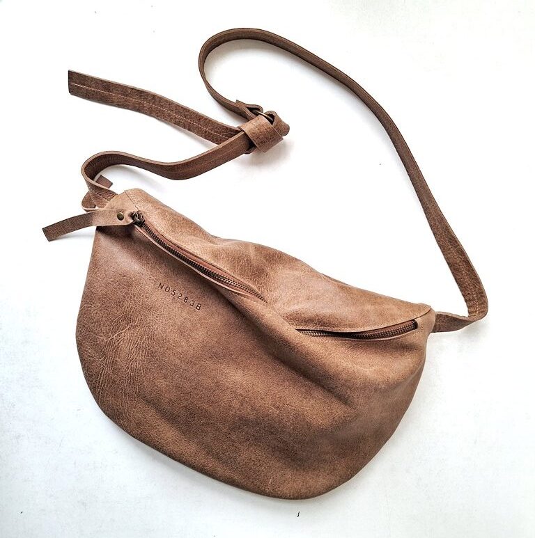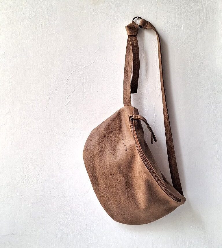 תיק פאוץ גדול עשוי מעור חום רך כל פאוץ שונה וייחודי בצורתו, ומוטבע על העור מספר סידורי. אפשר ללכת עם התיק על הכתף או באלכסון לגוף. פתח הרוכסן 35 ס"מ בתוך הפאוץ יש כיס אחד פתוח. הרצועה נסגרת בעזרת קשירה בתוך לולאת מתכת פליז