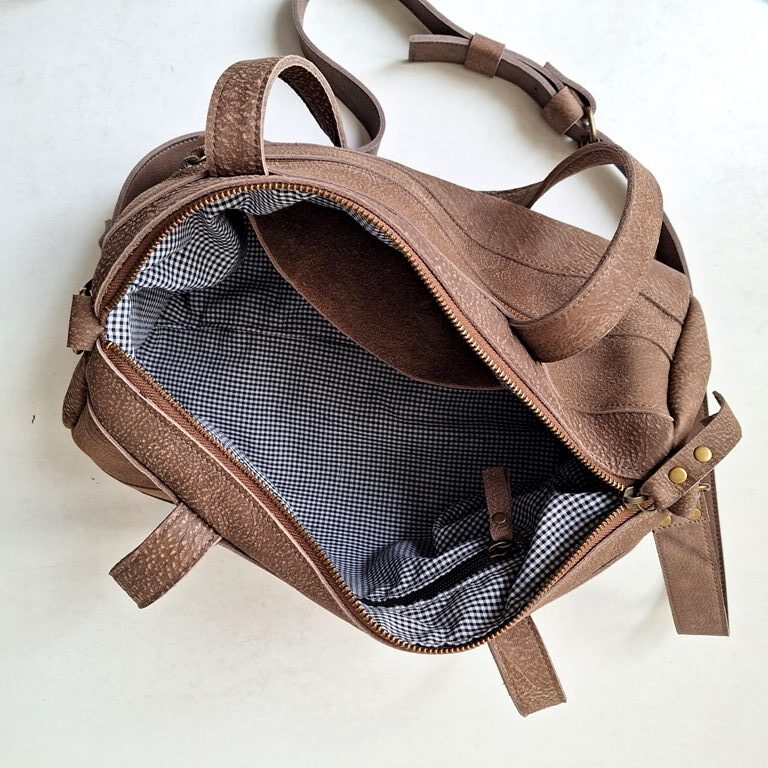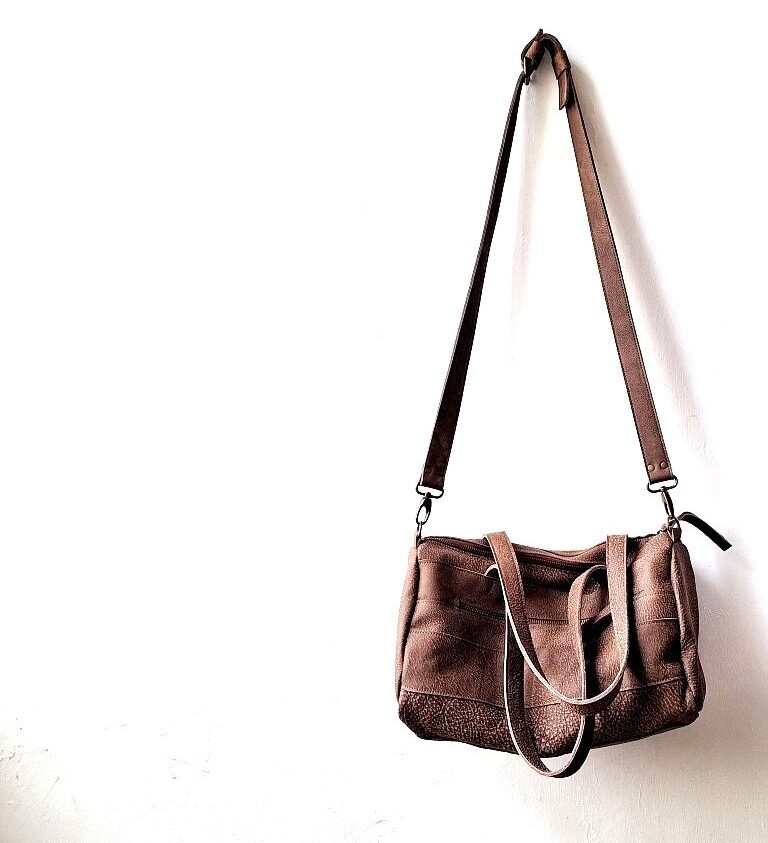 התיק תפור רצועות רצועות, מה שנותן לו מראה שיקי ומיוחד one off a kind.